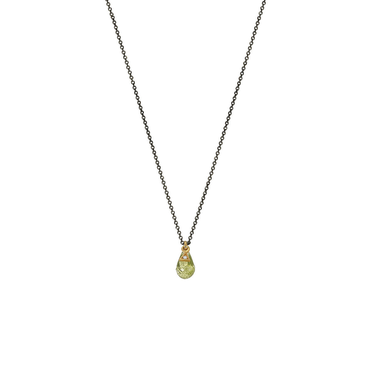 Μοτίφ σε κίτρινο χρυσό 14Κ με περίδοτο και 0,004ct L.G.Diamond. Διάσταση μοτίφ1,1*0,5cm ,με αλυσίδα ασημένια 925 επιροδιωμένη μήκους 40-45