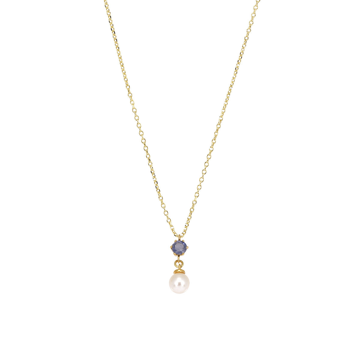 Μοτίφ σε κίτρινο χρυσό 14Κ με ιολίτη και μαργαριτάρι. Διάσταση μοτίφ 1,7*0,5cm ,με αλυσίδα σε κίτρινο χρυσό 14Κ μήκους 40-45cm