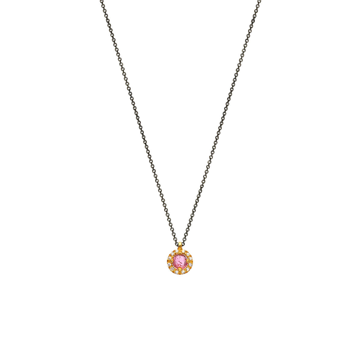 Μοτίφ σε κίτρινο χρυσό 14Κ με 0,048ct L.G.Diamond και tourmaline. Διάσταση μοτίφ 0.7cm ,με αλυσίδα ασημένια 925 επιροδιωμένη μήκους 40-45