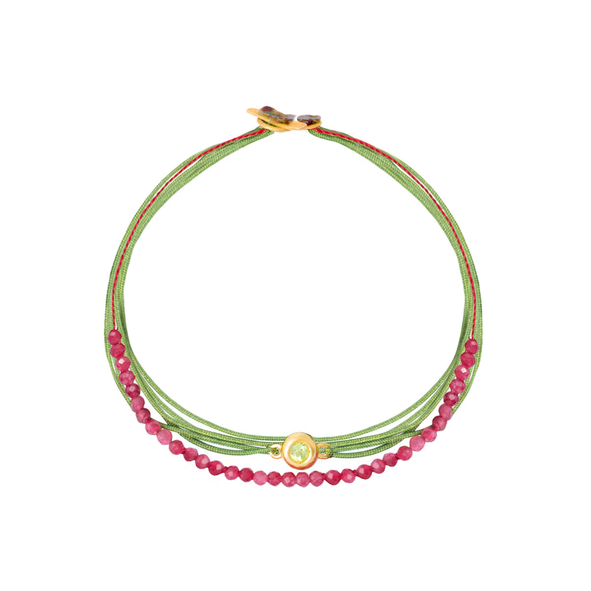 Βραχιόλι με μοτιφ , κούμπωμα σε κίτρινο χρυσό Κ14 και περίδοτο . Σε σύνθεση με ορυκτές και νήματα
