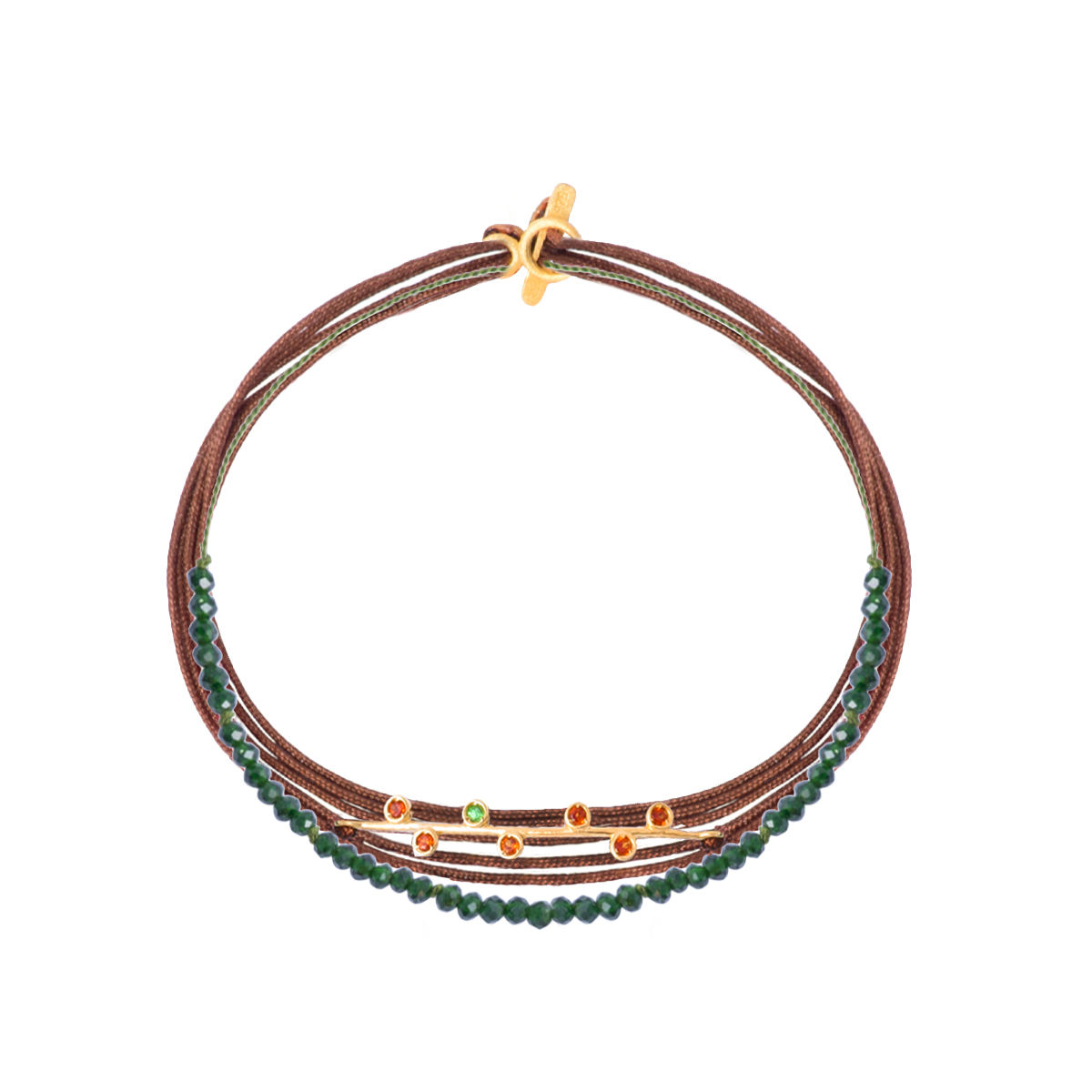 Βραχιόλι με μοτιφ , κούμπωμα σε κίτρινο χρυσό Κ14 και γρανάδα- τζαβορίτη. Διαστάσεις μοτιφ.3,3*0,5cm . Σε σύνθεση με ορυκτές και νήματα