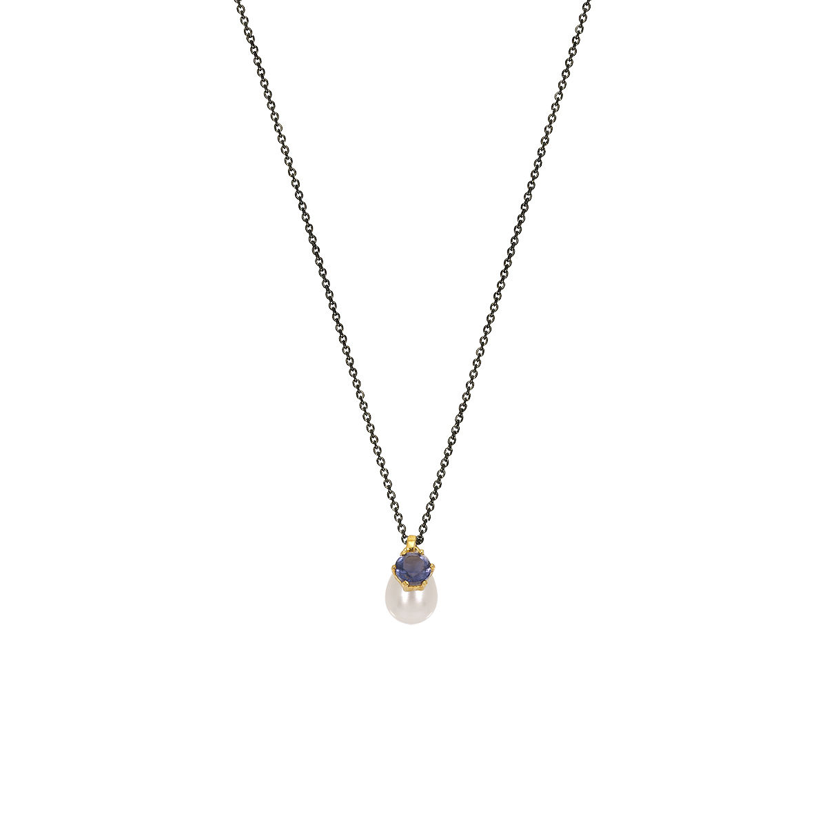Pendant in yellow gold 14K with fresh water pearl and iolite. Pendant size 1,1*0,6cm with chain in silver 925 rhodium plated adjustable in 40 and 45cm.