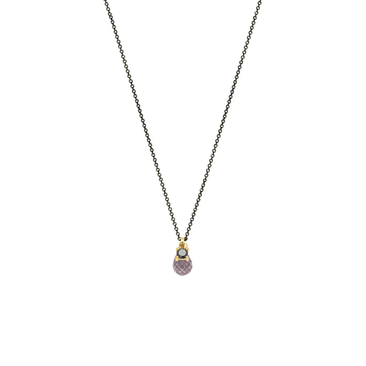 Pendant in yellow gold 14K with amethyst and 0,10ct black Diamond. Pendant size 1,1*0,5cm with chain in silver 925 rhodium plated adjustable in 40 and 45cm