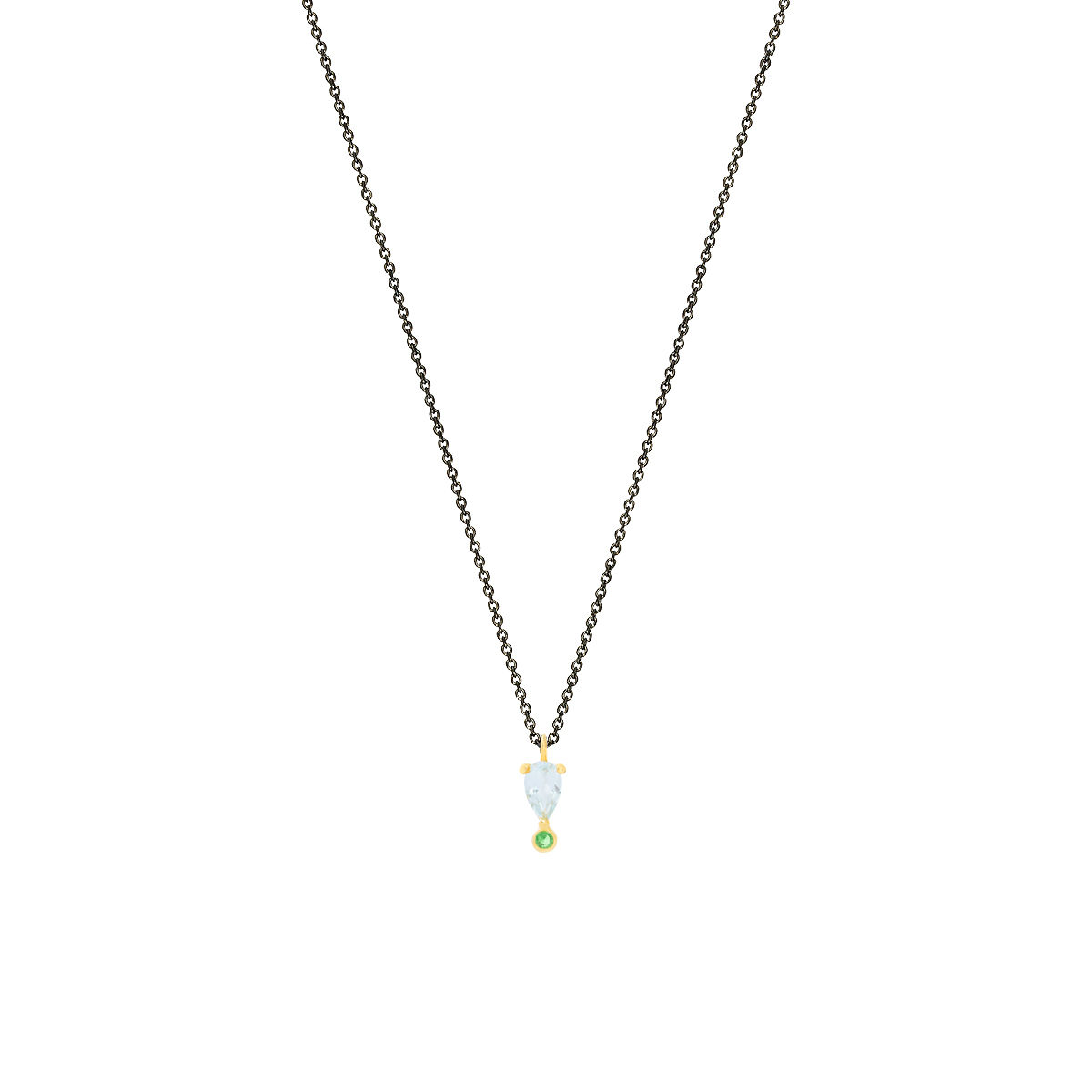 Pendant in yellow gold 14K with blue topaz- tsavorite. Pendant size 1*0.4cm with chain in silver 925 rhodium plated adjustable in 40 and 45cm